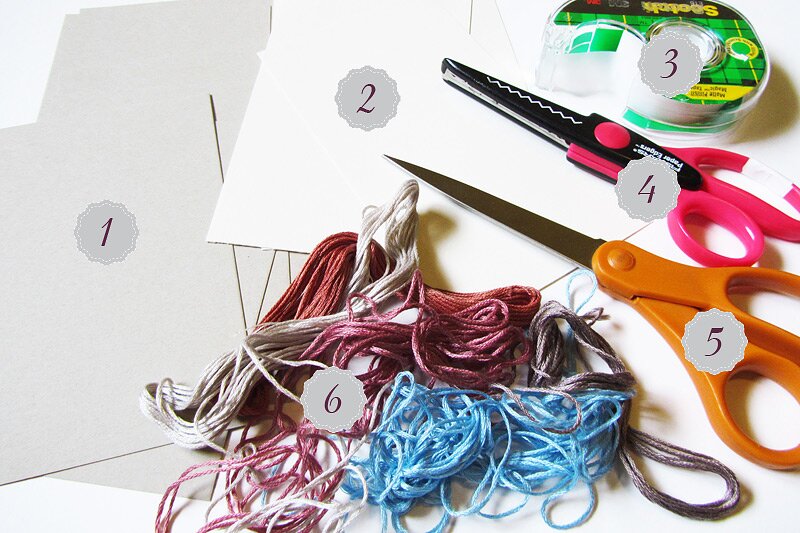 What you need: 1 base paper | 2 invitation paper | 3 weak tape | 4 zig-zag edged scissors | 5 scissors | 6 colored string